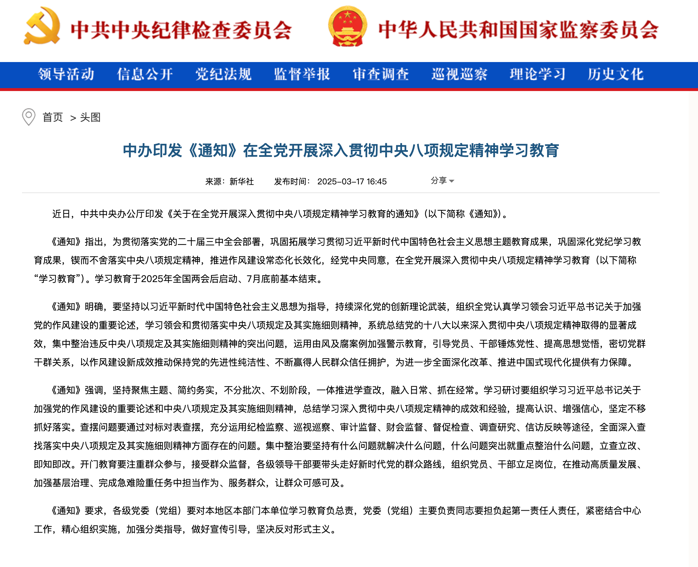 中办印发《通知》在全党开展深入贯彻中央八项规定精神学习教育